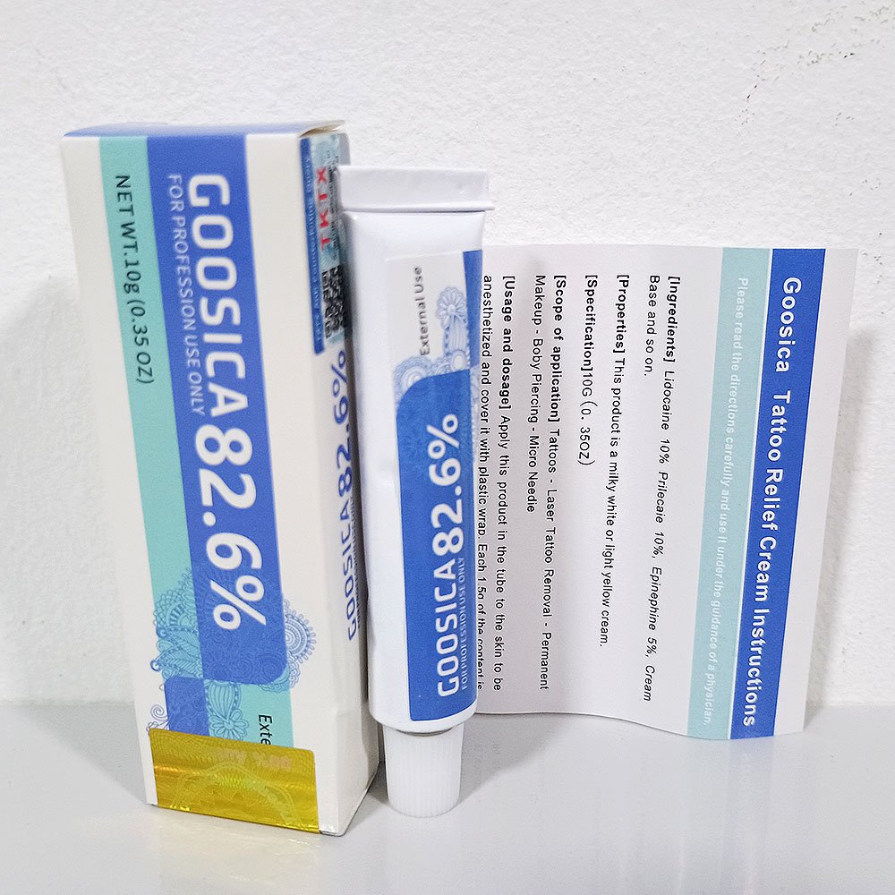La Crema anestésica Goosica 82,6% está diseñada para ayudar a disminuir la sensibilidad de la piel durante procedimientos de tatuaje, facilitando el trabajo en sesiones prolongadas y en zonas delicadas.