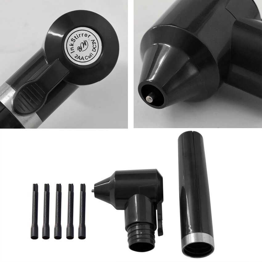 Nombre del artículo: mezclador de tinta de tatuaje. + 5 palillos. Está hecha de plástico de alta calidad. Firme y duradero, adecuado para un uso prolongado. Color: Negro Es una forma perfecta de mezclar los colores pulsando el botón. Mantener limpio y sanitario. Los palillos de tinta de tatuaje son desechables, solo para un solo uso. Son necesarias 2 pilas AA para el funcionamiento.(No incluido) Ligero y portátil, tamaño perfecto para un fácil transporte y uso práctico. Lista de embalaje: 1 mezclador de tinta de tatuaje (la batería no está incluida) 5 palos de mezclador tinta de tatuaje